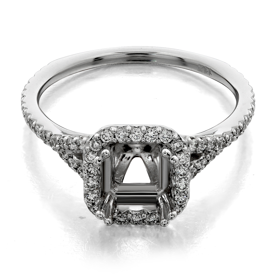 Halo ring with split shank emerald cut center