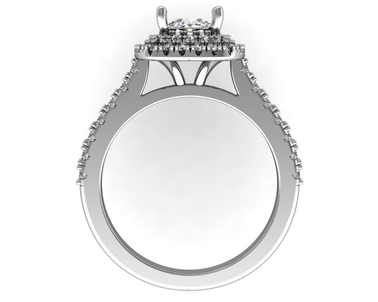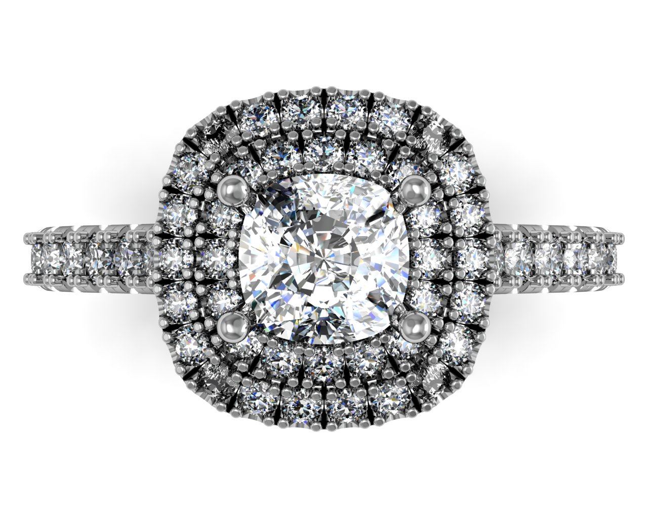 Two row halo split prong set cushion center