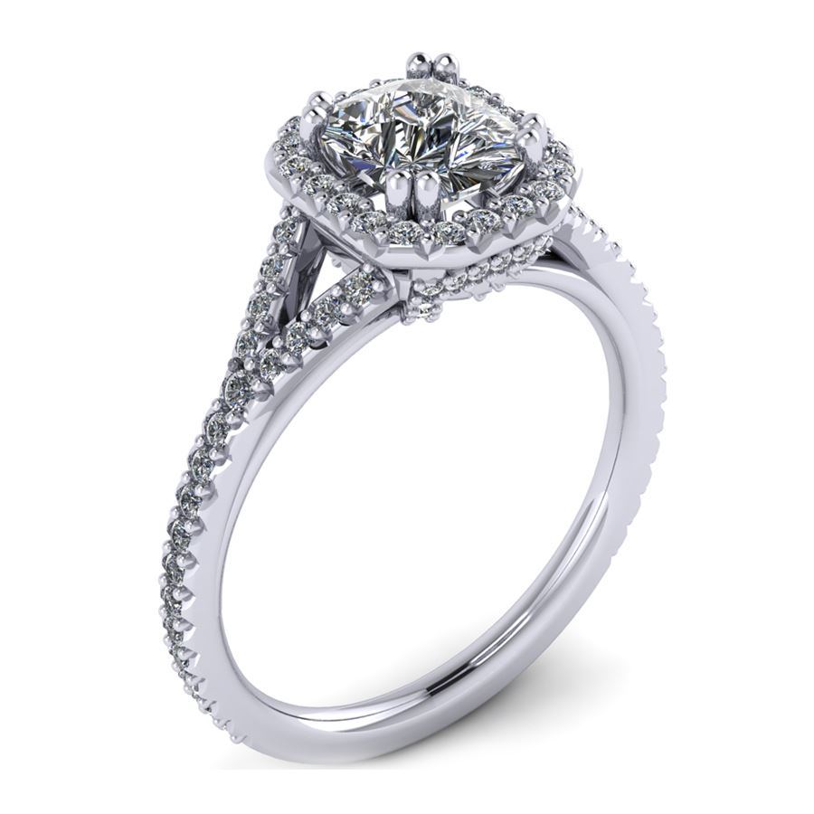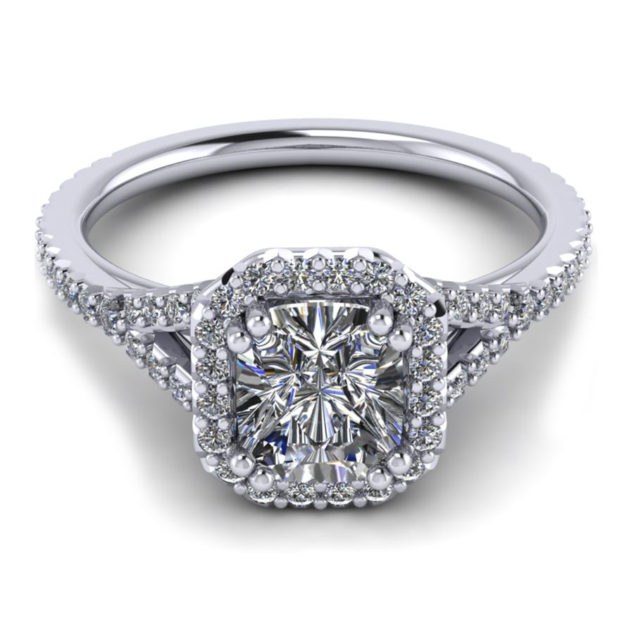 Halo ring with split shank emerald cut center
